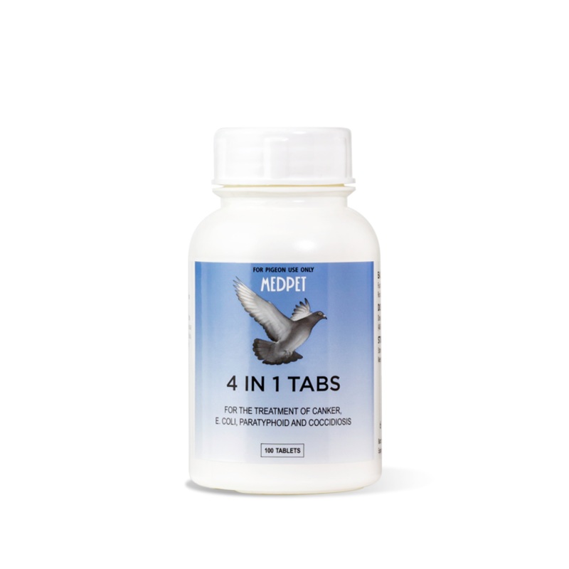 Four in one pigeon treatment tablet for paratyphoid, canker, coccidiosis and especially E.coli.Composition: Furaltadone 20%, Ronidazole 7%Dosage Treatment:As a pigeon treatment, give one tablet per bird/ day, for 7 consecutive days.Advise:Multivitamins sho