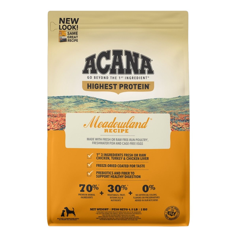 Loaded with 70% meat, ACANA Meadowland is brimming with free-run Cobb chicken, Tom turkey, nest-laid eggs, Blue catfish and Rainbow trout delivered fresh in WholePrey ratios to mirror the evolutionary diet.Prepared in our Kentucky DogStar kitchens from Ame
