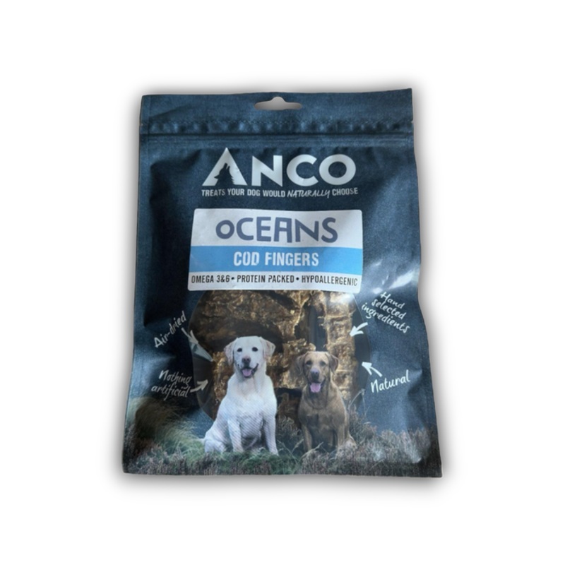 Anco Oceans Mackerel Fingers with Cod 100gKey BenefitsHigh in Protein, Low in Fat: Naturally rich in protein, with less than 2% fat, making it a healthy, lean treat.Ideal for Sensitive Stomachs: Gentle on digestion, suitable for dogs with pancreatitis or s