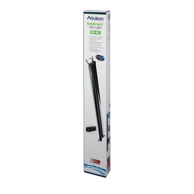 The slim, low-profile OptiBright LED fixture features permanent LED lights ideal for a variety of aquariums. Two individual waterproof touch controls provide the option to have the bright white/red LEDs on during the day and the subtle blue moon glow accent LEDs at night. The fixture also includes adjustable legs that can be extended to accommodate multiple aquarium lengths. Ideal for freshwater or saltwater fish and aquariums with low-medium light level plants. Aqueon products offers a wide range of items so that you can build and maintain a healthy aquatic environment. All the essentials from fish tanks, filters, lighting, food, care, and other supplies that your pet fish needs. We make it easy for you to get your first aquarium and to grow in the hobby as you become more of a fish expert with every step you take and every new thing you learn. For those seasoned hobbyists, we are committed to aquarium product innovation so that we continue to offer products that get you excited. With the Aqueon brand, it’s all about the fish.