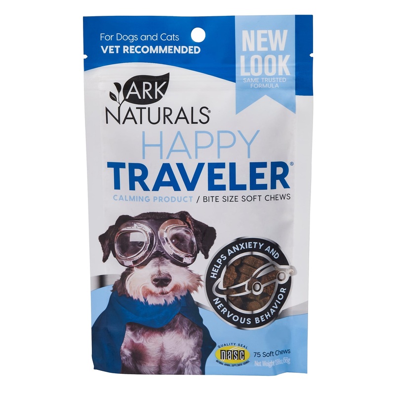 Ark Naturals Happy Traveler Soft Chews ease anxiety and motion sickness in cats and dogs. Useful for separation anxiety travel anxiety socializing a nervous or excitable pet into a new environment during thunderstorms fireworks airline travel visits to groomers vets and kennels. Non-habit forming. No harmful side effects when used as directed.