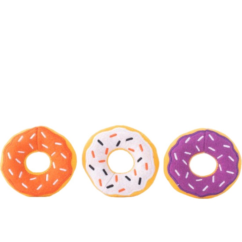 Anytime Mini Donuts make the perfect squeaky toys for small dogs and puppies!Choose from 3 colors - Orange, White with sprinkles and Purple1 round one small squeaker in each donutSize : 3.5" x 3.5" x 1"