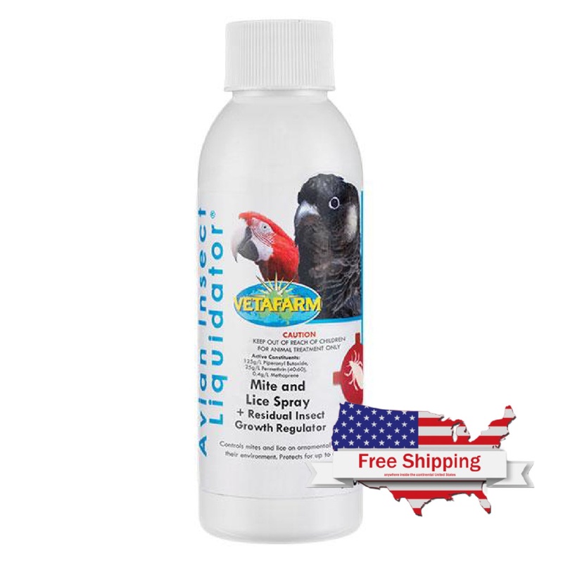 Avian Insect Liquidator (Vetafarm) Recommended for: Use on mites, lice, flies, spiders, ants or any situation where external parasites are a problem, including nest boxes, flights, perches, aviary floors, indoor cages and for direct application to the bird.