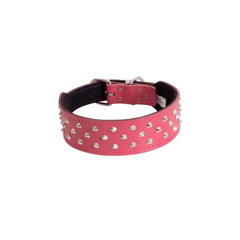 The Beau Pets Pink Studded Staffy Collar is a studded leather dog collar, that is shaped specifically to suit staffy breeds. These high-quality leather dog collars are made in Australia from hide leather and are lined for added comfort. The collar also features a heavy-duty buckle, as well as a D ring for your pets ID tag to be easily attached. There are three rows of conical chrome studs that will have your dog looking and feeling like a stud. The measurement of these collars is measured from the inside buckle to the end of the collar.
