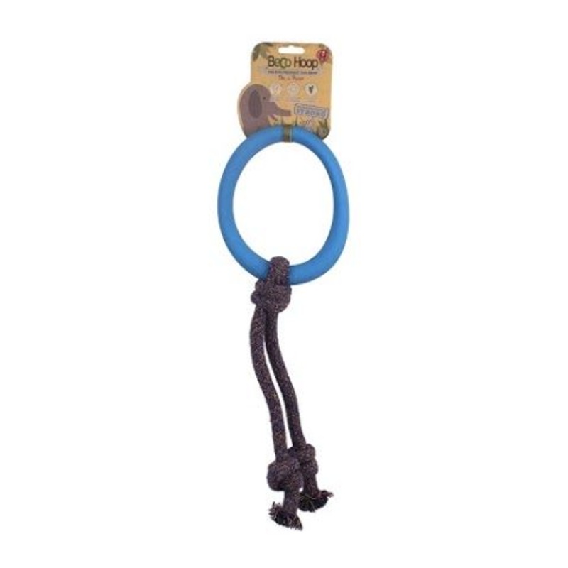 Ready. Set. Go. Let tug-o-war begin. The springy natural rubber hoop softens the blow as your dog pulls on one end. The soft recycled cotton rope, fastened with chunky knots, gives you a good grip on the other.DIMENSIONSS - 34cmL - 37cm BECO HOOP ON ROPEDe