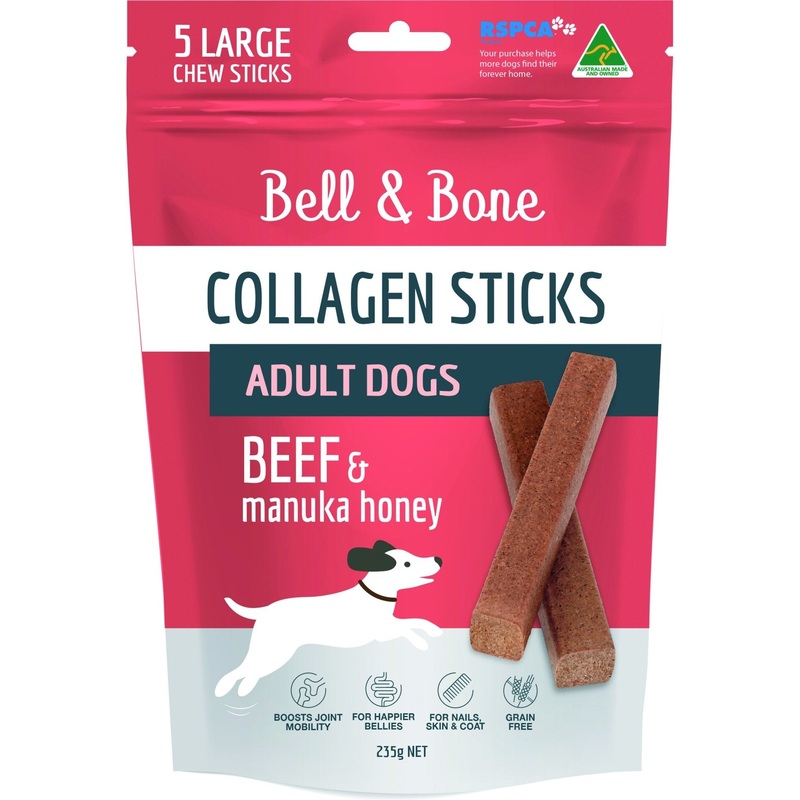 Bell & Bone Collagen Chew Sticks Adult Beef were created to boost and maintain your dogs collagen levels. Collagen makes up 70-90% of dogs ligaments, muscles and tendons. It is a natural supplement that helps lubricate and protect connective tissues that s