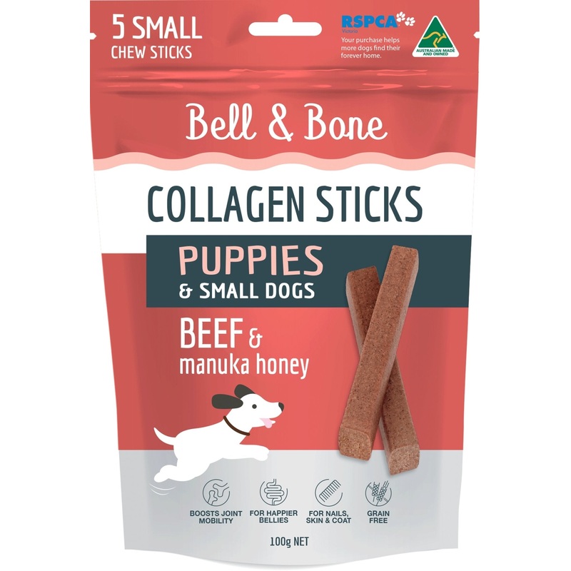 Bell & Bone Collagen Chew Sticks Puppy & Small Dog Beef were created to boost and maintain your dogs collagen levels. Collagen makes up 70-90% of dogs ligaments, muscles and tendons. It is a natural supplement that helps lubricate and protect connective ti