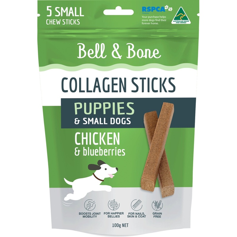 Bell & Bone Collagen Chew Sticks Puppy & Small Dog Chicken were created to boost and maintain your dogs collagen levels. Collagen makes up 70-90% of dogs ligaments, muscles and tendons. It is a natural supplement that helps lubricate and protect connective