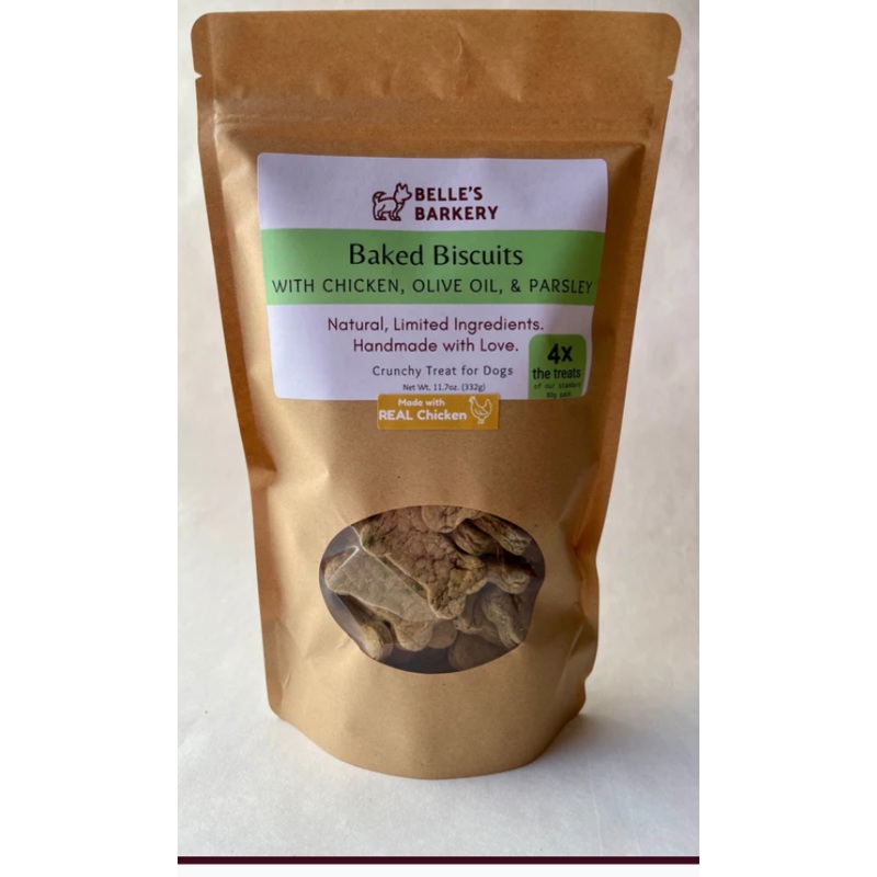 Calling all meat-loving dogs- we created a special treat for you! These crunchy dog treats are made with real chicken and bone broth that has simmered for over 12 hours! We add olive oil and parsley for a scrumptious, savory treat!This treat is made with o