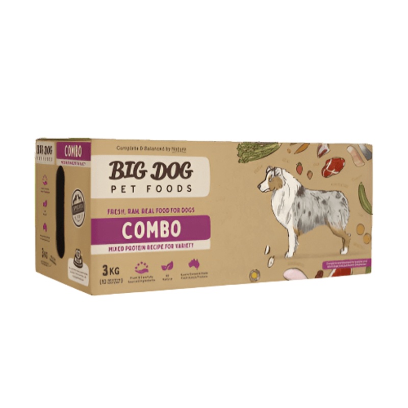 Big Dog 3kg ComboBig Dog Combo is a biologically appropriate raw food diet crafted with 100% Australian, human-grade ingredients, designed to support your dogs health and vitality through natural, species-appropriate nutrition. With no fillers, preservativ