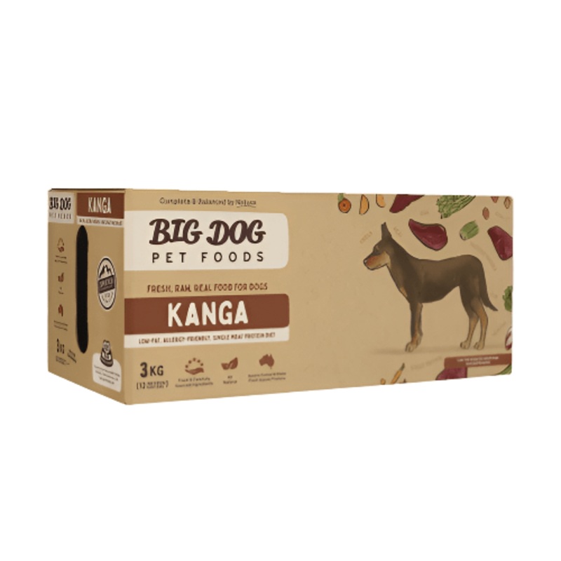 Big Dog 3kg KangarooBig Dog Kangaroo is a low-fat, single-protein raw food diet made with 100% Australian, human-grade ingredients, perfect for dogs with food allergies, intolerances, or those requiring a veterinary-advised low-fat diet.Kangaroo is a lean,
