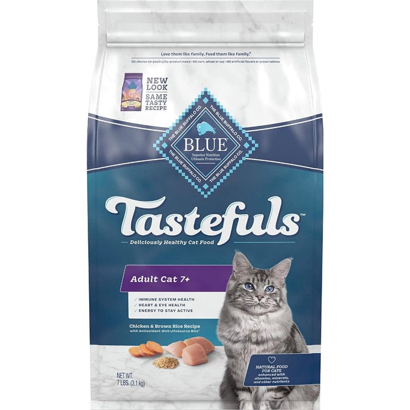 BLUE Tastefuls for Cats dry cat food recipes are made with the finest natural ingredients enhanced with vitamins and minerals. Starting with real meat as the 1st ingredient, they include wholesome grains, veggies and fruit, plus our exclusive, antioxidant-rich LifeSource Bits to support your felines overall health and well-being. BLUE for Cats has formulations to meet all of your cats life stage and lifestyle needs, from hairball and weight control to sensitive stomach and healthy aging recipes. BLUE for Cats is a product of the Blue Buffalo company. Based in the United States, Blue Buffalo makes premium-quality pet foods.