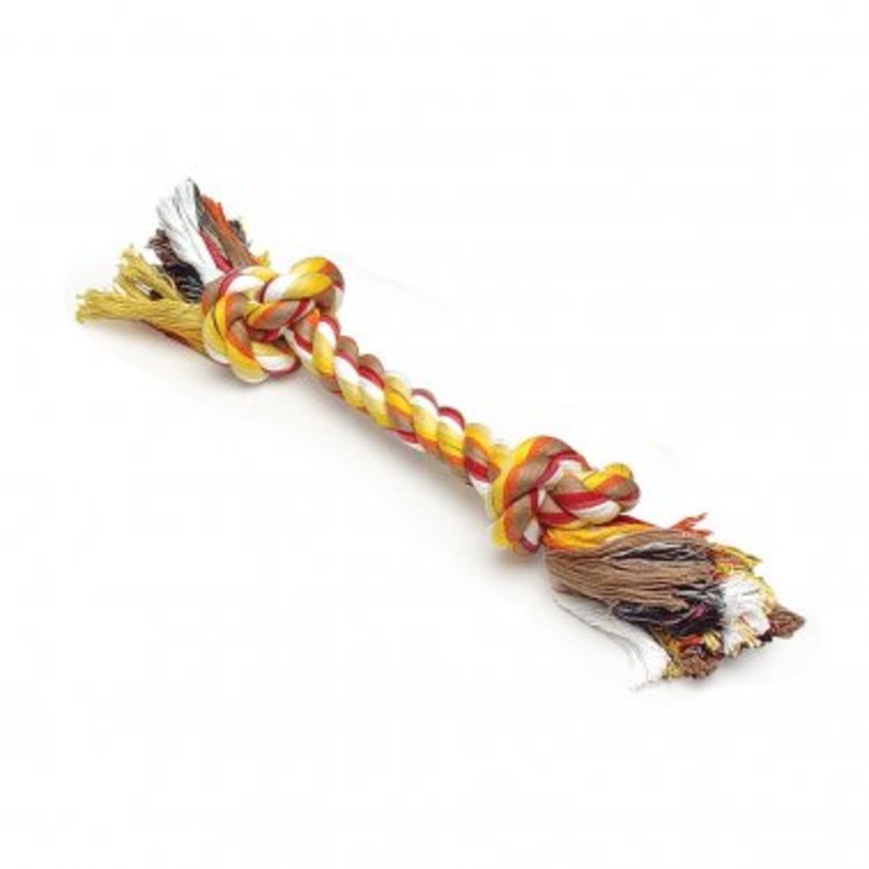 Multi-colored Booda 2-Knot Rope Bones can be used for interactive play or as solo dog chews. These rope bones are a fun and easy way to floss your dog's gums and help prevent dental disease by fighting plaque and control tartar. They feature machine washab