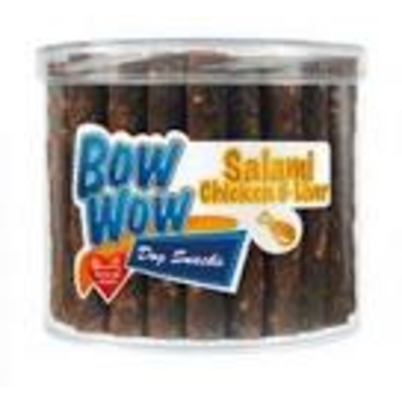 Bow Wow Salami Chicken & Liver Dog Treats are meaty, chewy sticks that your dog will loveEasily broken up into tasty chunksChewy texture helps rub away plaqueIdeal for a wide range of dogs
