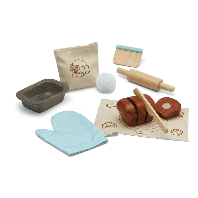 Role play as the owner of a bakery with the Bread Loaf Set! Made from PlanWood, a realistic loaf of bread can be cut with an included bread knife. A bread baking pan, rolling pin, dough-cutting knife, washable oven mitt, bag of pretend flour and bread-knea