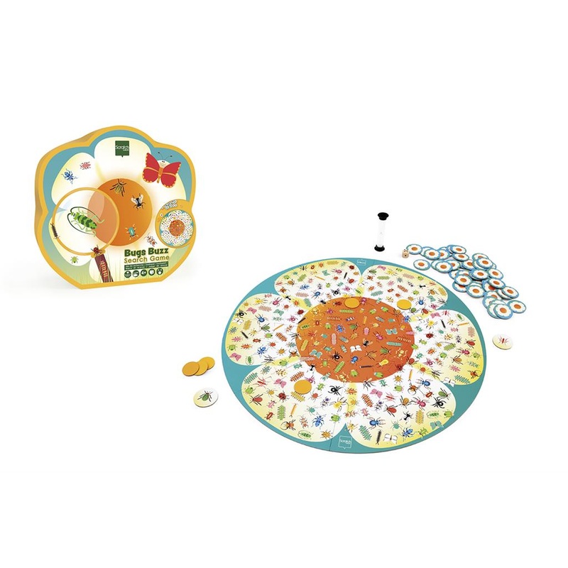 Gameplay: Throw the die and then flip 1 card at random, paying close attention to the insect shown. The hourglass is flipped along with the card. Now quickly search the game board to find the insect on the card the same number of times as the pips shown on the die. If the die shows 1 pip, you need only find your insect once. If you rolled a 6, you must find 6 bugs within the time limit. Use the yellow cards to cover the discovered bugs. With very young players, either dont use the hourglass or flip it twice to give the child more time.