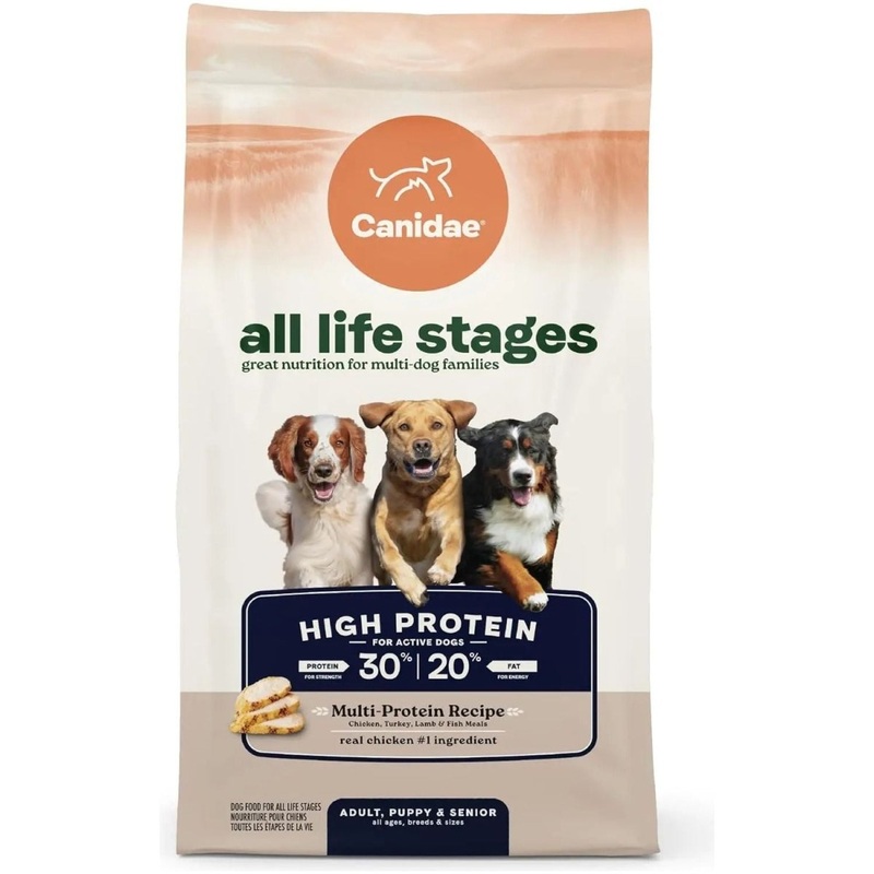 Fuel your furry friends with the nutrition they need to thrive with CANIDAE All Life Stages Multi-Protein High Protein Dry Dog Food. Tailored for multi-dog households, this premium formula is designed to meet the unique needs of active dogs of all breeds, sizes, and life stagesfrom playful puppies to energetic adults and seasoned seniors. With 30% protein and 20% fat, this nutrient-rich recipe supports muscle development and keeps your dogs fueled for outdoor adventures. Chicken is the first ingredient, providing a punch of high-quality protein along with a taste your dogs will love. Developed by vets and pet nutrition experts, CANIDAE ensures every bite is packed with essential nutrients to maintain your dogs’ peak performance. Finally, an all-in-one solution that simplifies mealtime and keeps your pack happy, healthy, and ready for their next adventure!
