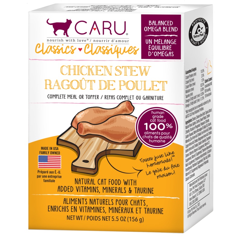 If you have a cat whos super-picky or simply hungry for a home-cooked meal, have we got a stew for you! Featuring USDA-inspected chicken as the first ingredient, this functional, grain free stew is crafted from 100% human grade ingredients in the United States. Weve also added a balanced blend of Omega fatty acids to help your kitty thrive with every bite. Caru Classic Stews for cats are cooked in small batches to look, smell and taste like homemade. Crafted to nourish both cats and kittens, these terrifically tasty recipes are: