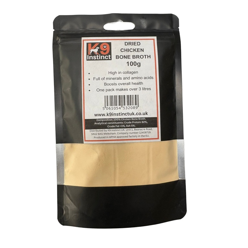 Made from 100% free-range chicken bones, this nutrient-rich powder is packed with collagen, glucosamine, and minerals to support joints, digestion, and overall health. High protein, low fat, hypoallergenic, and perfect even for sensitive or fussy dogs.Prot