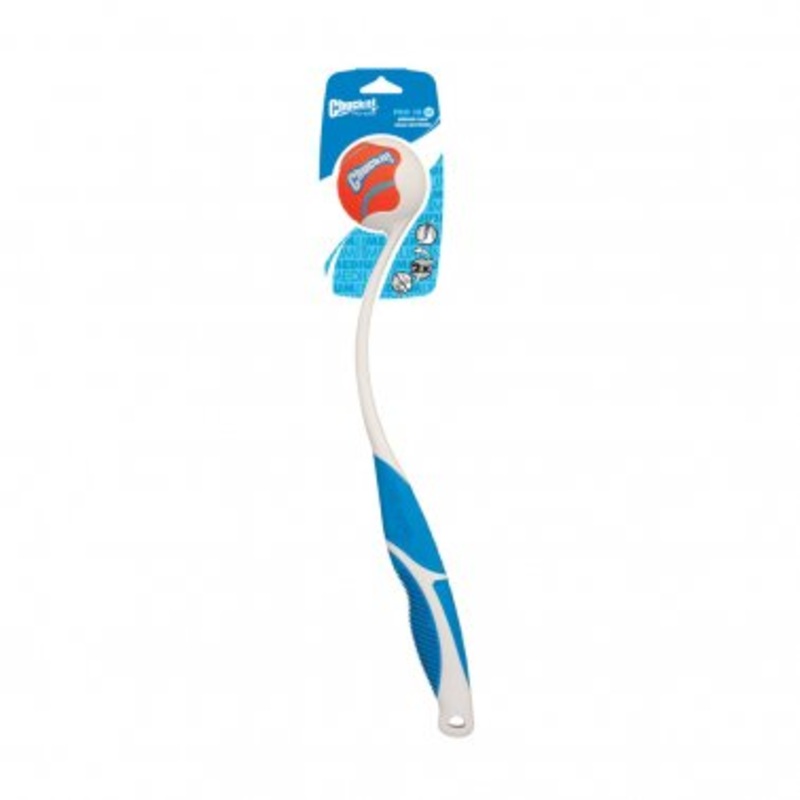 Throw farther, faster, and never bend down to pick up a slimy ball again with the Chuckit! Pro Launcher. A durable plastic launcher that firmly grasps a ball then releases it as you swing. Simply grab the comfortable handle, press down on the ball and let