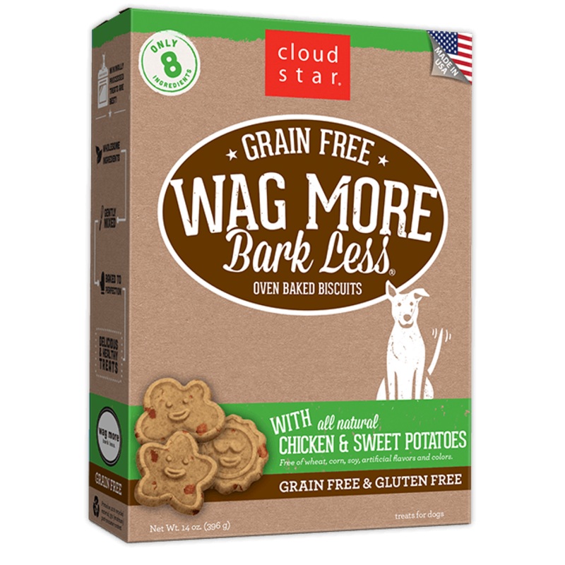 Wag More Bark Less Grain Free Oven Baked treats are delicious, wholesome treats without the grain.-Limited ingredients in a crunchy-textured treat-No grain, gluten, dairy, corn, soy, or white potatoes-In cute smiling star, sun and cloud shapes-With chunks