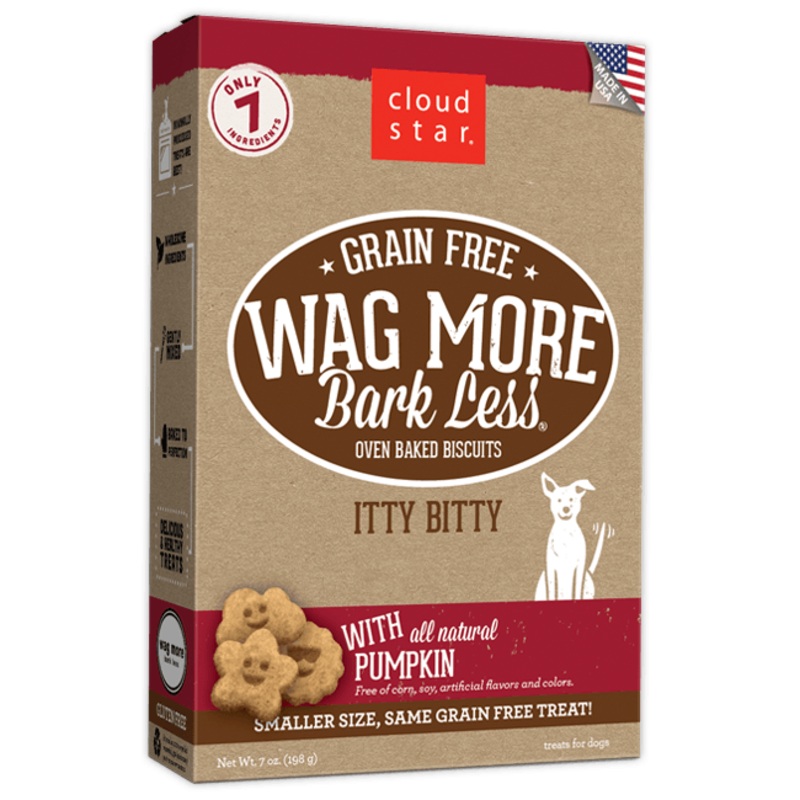 Wag More Bark Less Grain Free Itty Bitty Oven Baked Treats are bite-sized grain free treats perfect for small breed dogs.-Limited ingredients in a crunchy-textured treat-No grain, gluten, dairy, corn, soy, or white potatoes-Perfect little bite-sized treat
