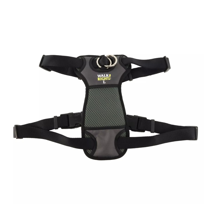 Put an end to pulling and tugging during your walks with the Walk Right! Front-Connect Padded Dog Harness! This innovative harness offers two leash connection options to help train your dog to walk properly. The front connection directs your dog by the chest strap, naturally diverting their attention without causing neck strain. Once your dog is accustomed to walking right, you can utilize the optional back connection on the harness. Your dog will appreciate the comfort provided by the soft padding, while you’ll love the convenience of the over-the-head design for easy on-and-off. Select your preferred color and enjoy your next walk with this effective harness.FeaturesFront-connect D-ring.ApplicationsTeaches your dog to walk right.