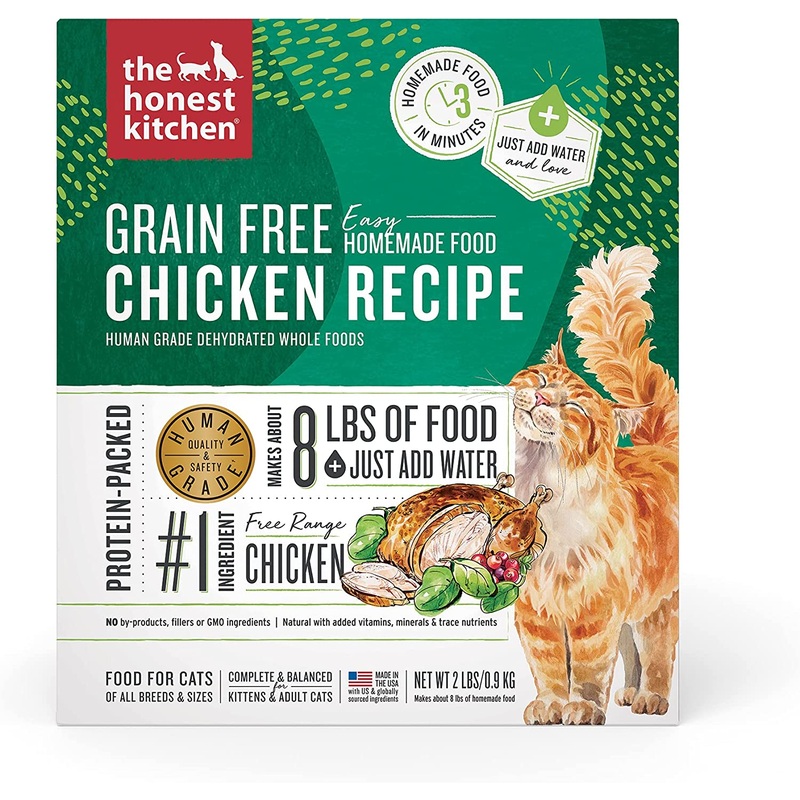 by The Honest Kitchen – Crafted with a vet nutritionist, this 100% human grade grain free dehydrated cat food recipe is packed with tasty free range chicken, boosted with probiotics to support digestion, and finished with a splash of nutritious bone broth to add extra flavor and boost protein. To meet our human grade standard, we use the same whole foods youd recognize in your own kitchen, and make this recipe in a human food facility. Simply add water to this healthy-yet-tasty recipe for a protein-packed, moisture-rich meal your cat will love.