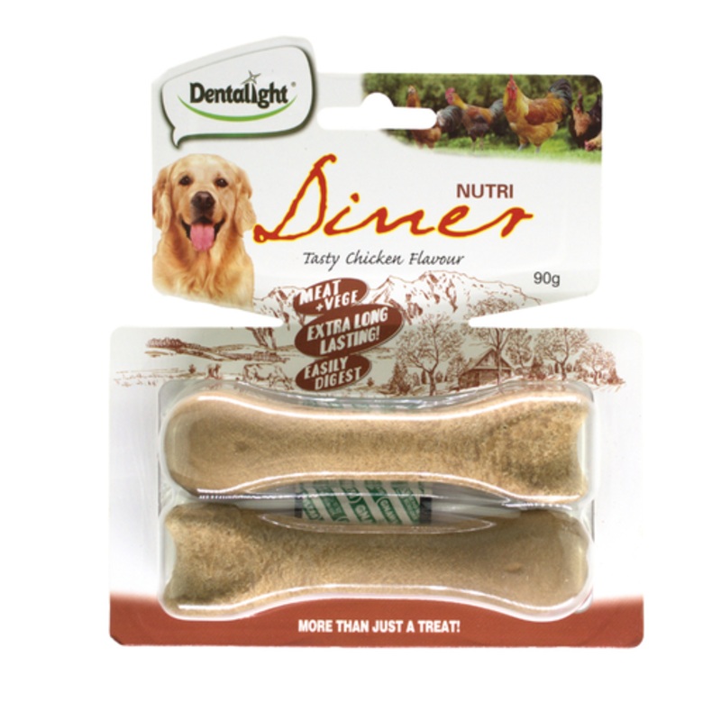 Dentalight 4.5" Nutri Diner Dog Treat 90g (2pcs) - Chicken FlavourNutri DinerDaily Treatsare healthy, wholesome treats with the delicious chicken flavours dogs love.Made with real chicken, vegetables and added vitamins and mineralswith no added salt, sugar