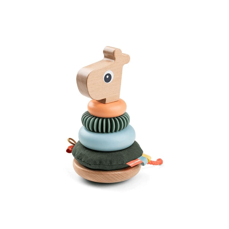 A stacking toy with colorful rings featuring Raffi the giraffe design. This toy helps babies develop their coordination and problem-solving skills while having fun stacking the pieces.