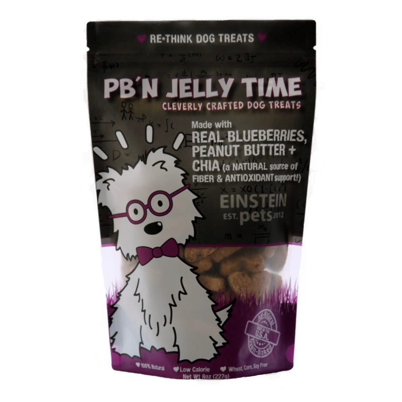 Einstein Pets PB’N Jelly Time is everyone’s favorite biscuit. Your furry friend is sure to find the full-flavored taste and auroma of fresh baked PB+Blueberry Recipe Dog Treats that are truly drool-worthy. These limited natural organic ingredients, healthy dog treats with s omega-3 rich Chia Seed biscuits are created in small batches, and oven baked. Featuring only real human grade ingredients — and zero by-product meals or fillers. They’re a pup-worthy treat.