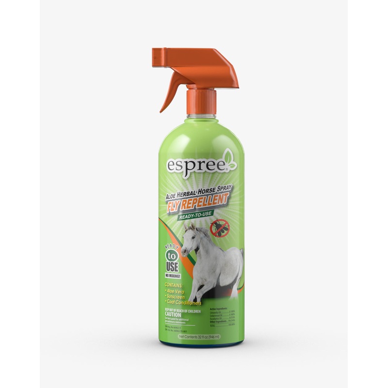 Ready to Use NO MIXING!A gentle blend of ingredients, including botanical oils, helps repel flies on horses. Aloe Herbal Ready-to-Use Horse Spray contains coat conditioners and sunscreen, which promote a healthy coat and provide protection from the sun.Dir