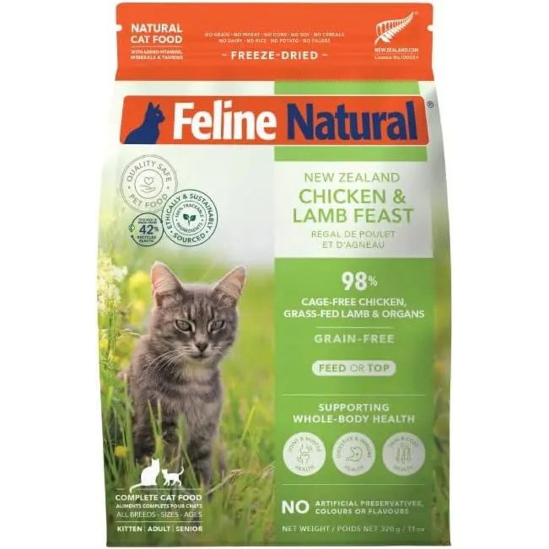 Elevate your cat's dining experience with Feline Natural New Zealand Chicken & Lamb Feast Grain-Free Freeze-Dried Cat Food. Specifically formulated for the discerning feline, this premium recipe boasts a rich blend of cage-free chicken and succulent free-r