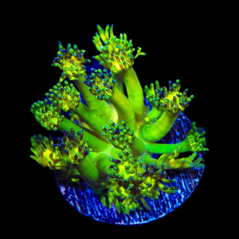 Typically showcasing hues of green, yellow, pink, or purple, Goniopora corals create a mesmerizing display as their polyps extend and sway with the flow of water. Known for their moderate care requirements and adaptability, they are an excellent choice for intermediate reef keepers looking to add a dynamic focal point to their aquascape.