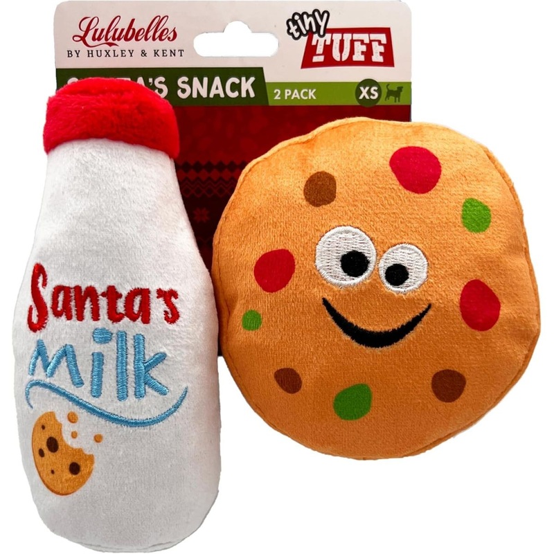 Make this holiday season merry and bright for your pup with our Tiny Tuff Santa's Snack dog toy. This delightful 2-pack features adorable miniatures of Santa's favorite treatsa bottle of milk for Santa and a delightfully cheerful cookie. Perfectly sized an