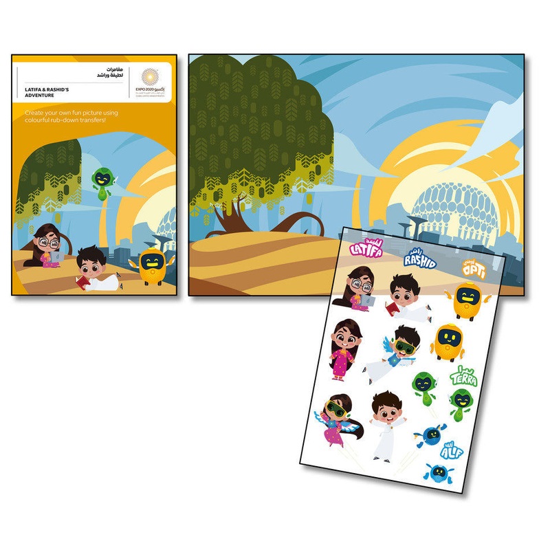 Latifa & Rashid Expo Adventures - this Dubai Expo 2020 transfer game stimulates creative play in a way thats easy for anyone to enjoy.With the transfer sheet, children can create their own stories by filling backdrops with Dubai Expo 2020 Mascot characters