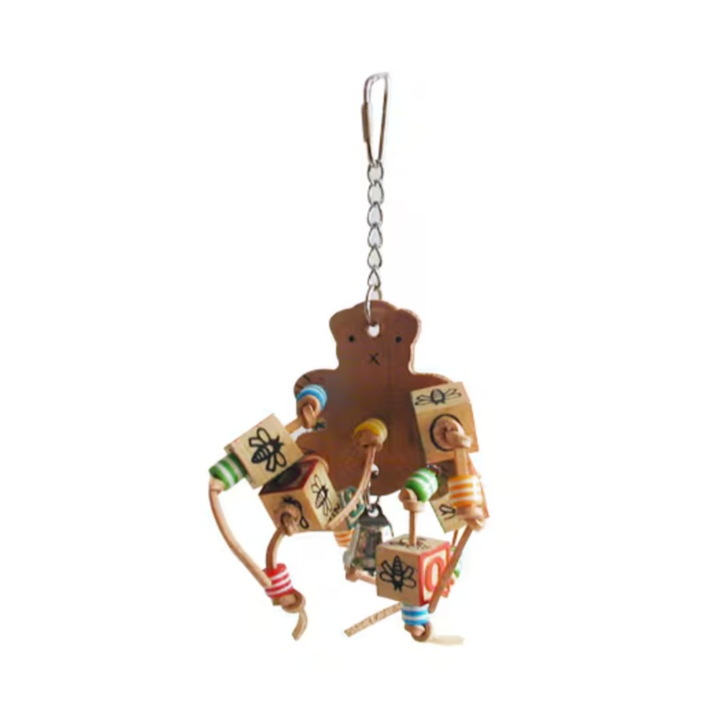 Leather Bear with ABC BlocksTechnical Details Exterior Dimensions: 9.8 x 4.7Product Features Leather Bear with ABC Blocks Durable construction for extended uses Easily clips to the top of the bird cage