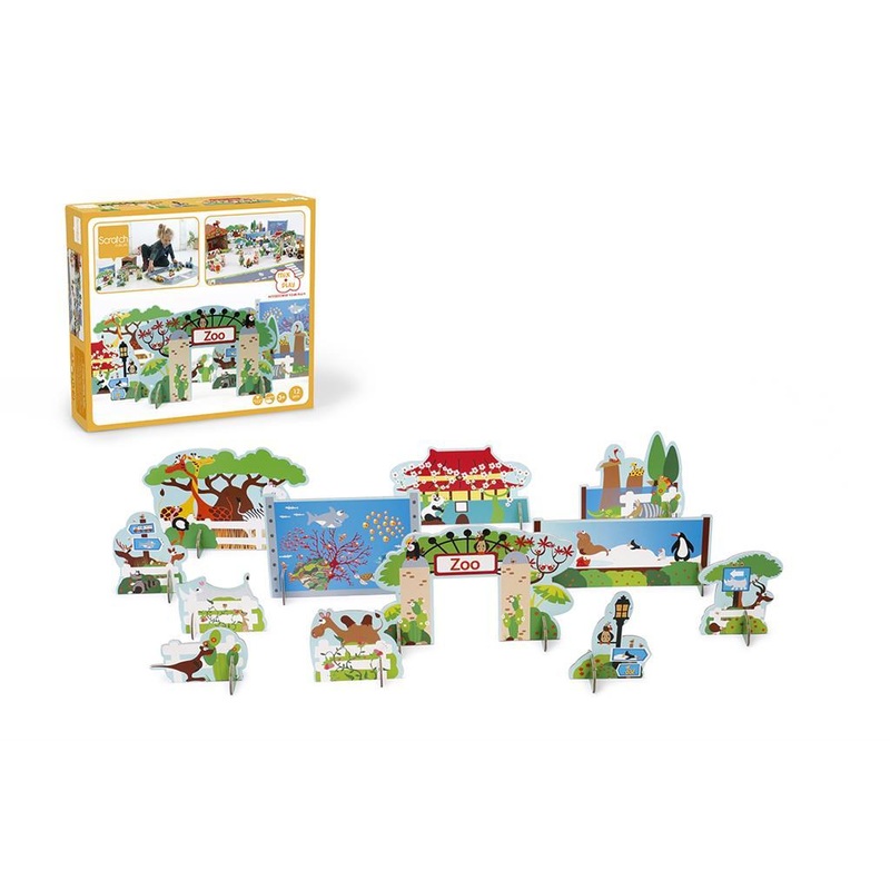 With this cool set you can transform your play area into a real Zoo! Go in search of wild animals, explore the underwater world or meet the penguins and seals sliding around on the ice.The set is made of durable cardboard. Each piece is printed on both sid