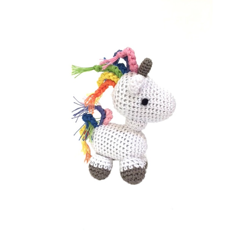 Handmade interlace organic cotton thread, this happy unicorn with multi-color details is designed to be a flexible toy. It improves dental health when chewing as it helps to remove dental plaque on the teeth.