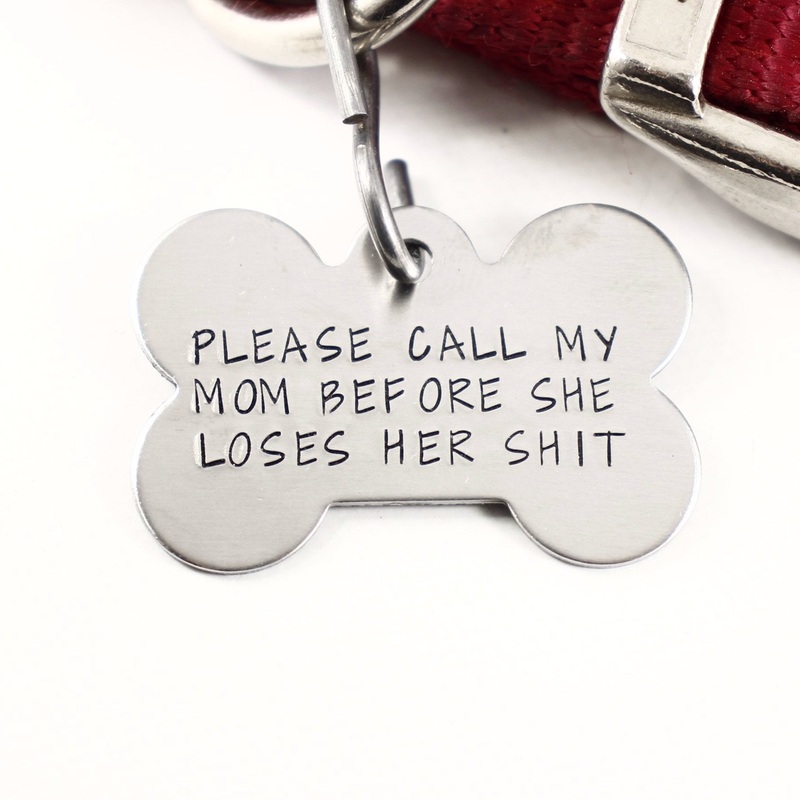This custom, bone shaped, 1 x 1.5 tag will be hand-stamped with the text "Please call my mom before she loses her shit". Your pet's name and your phone # can be added on the BACK at no additional charge.Specifications/FAQ:There is insufficient room for add