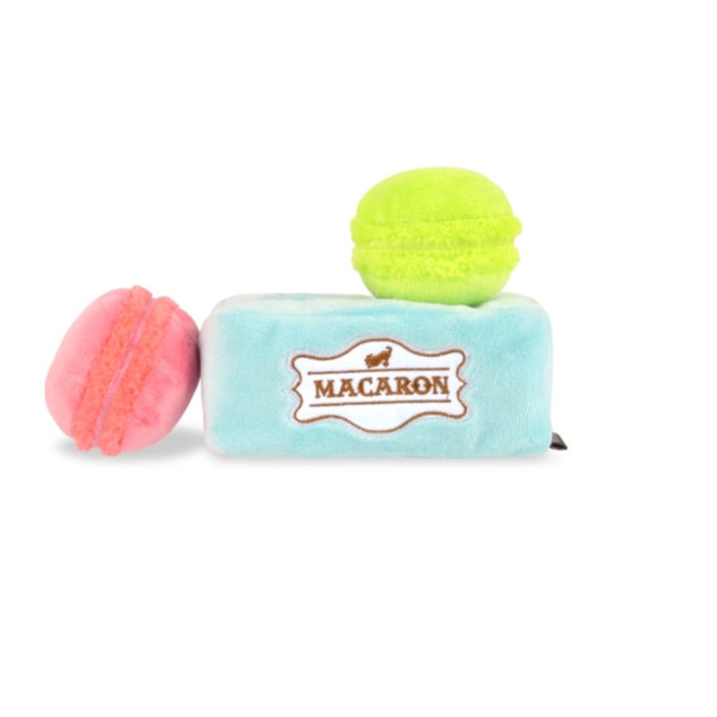 This Mini Pup Cup Caf Mutt-a-rons toy brings the joy of a macaron-inspired playtime to small dogs with two squeaky plush treats tucked inside a crinkly blue box!