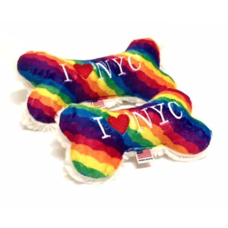 Our I LOVE NYC Rainbow stuffing free dog bone with squeaker will for sure put a smile on your pups face!