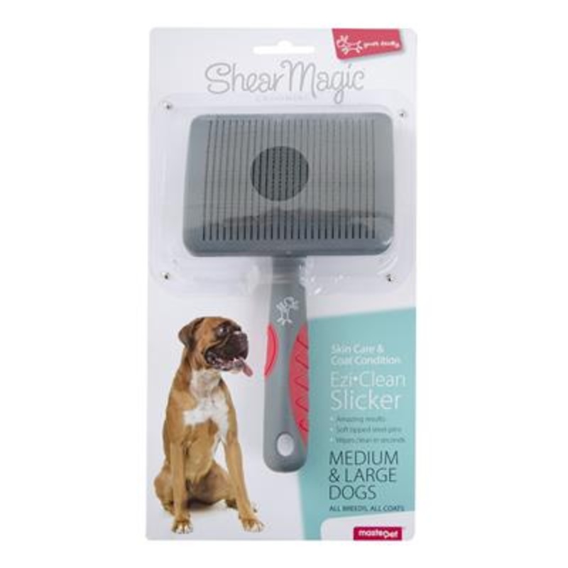The Yours Droolly Shear Magic Ezi-Clean Slicker is an easy-to-clean, professional-quality moulting brush that helps remove excess fur and tangles in your dogs coat. This gentle metal pin bristle brush penetrates through to the thick layers of your pets top