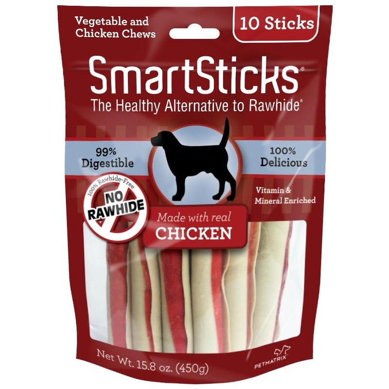 SmartSticks is the next generation dog chew that has all the benefits of a rawhide chew without the rawhide. Many veterinarians are concerned with the potential health risks associated with dogs consuming rawhide. SmartSticks chews, made with real chicken,