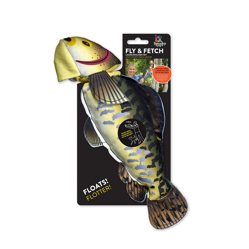 Enhance your pup's playtime with Spunky Pup's Fish Launching Fly and Fetch Toy! Launching up to 100 feet in the air, this toy will really capture your dog's attention! Built with a durable canvas and a squeaker, this toy is perfect to keep the fun going!Sp