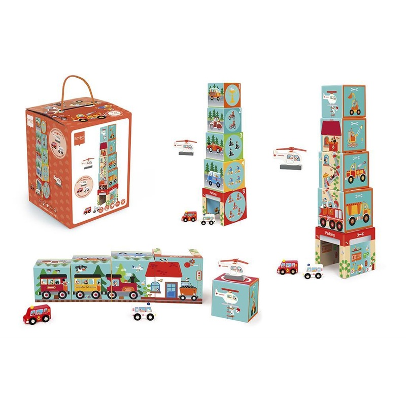 A brightly coloured tower of blocks with five cubes of different sizes. The blocks can be stacked on top of each other, and they can also be placed next to each other to make a puzzle. Try to piece the hidden puzzle together by fitting the blocks with the right face next to each other. Pictures of animals, people and numbers can be found on the five faces. Fun, but also educational! The largest block is a garage with parking space for the fire truck and ambulance that come with the set, and youll find a helicopter landing pad at the very top of the tower. Stacking, making puzzles, counting, recognising animals and people and so much more! The tower is made of sturdy, durable cardboard, while the vehicles are made of wood.