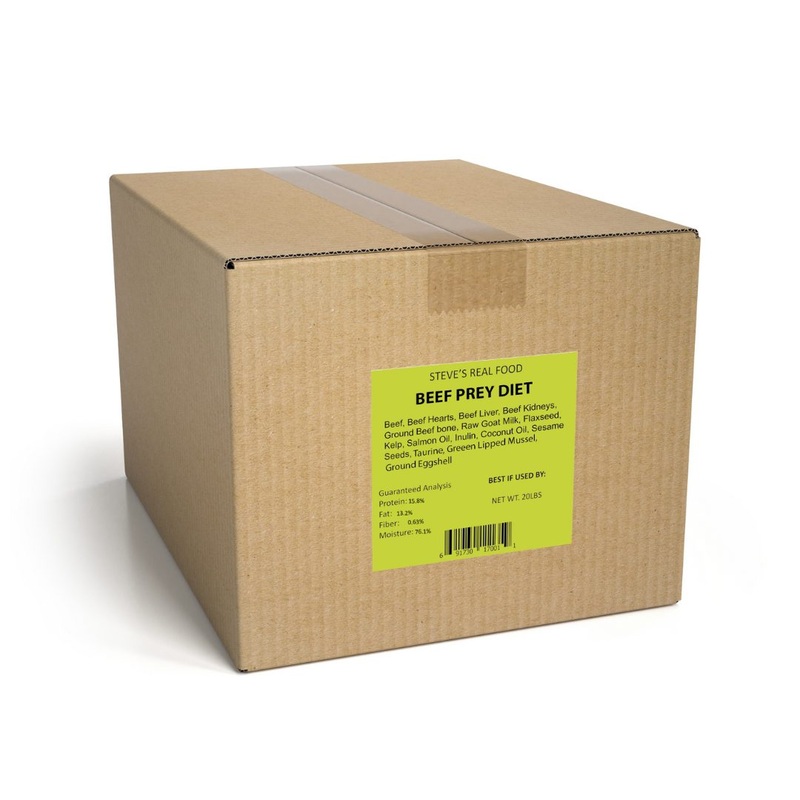 Steve’s Real Food PREY Model Raw Beef Diet is the perfect choice for pet owners who want to provide their cats and dogs with a natural, nutrient-dense protein option. The beef is free-range, grass-fed, and grass-finished. It includes 95% muscle meat, organs, and bones, with the other 5% composed of healing superfoods such as coconut oil, New Zealand Green-Lipped Mussels, and raw goat milk. The prey model diets are complete and balanced for both dogs and cats. Prey diets are ideal for an active or pregnant/lactating pet looking for a high-calorie diet. .