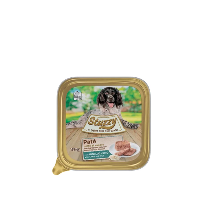 Actual pieces of meat and natural ingredients, in a delicious steamed recipe. Discover Stuzzy Pat with Lamb and Rice: a complete dog food that turns every meal into a moment of genuine quality, well-being and luscious delight. Size:150g alutraySuitable for