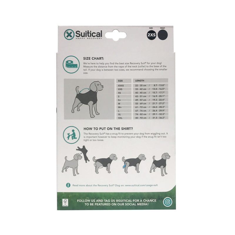 The Recovery Suitshould fit like a second skinnot too tight, but certainly not too loose! A proper fit ensures your dog cannot reach sensitive areas. Measure your dog from the neck to the base of the tail and check the size chart to find the right fit. If your dog falls between two sizes, always choose the smaller one. Also, consider your dog’s amount of hair and body shape for the best fit.
