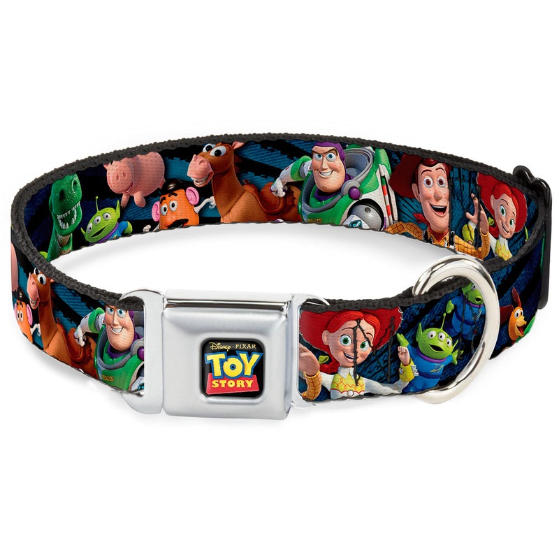 Y31689955TOY STORY Logo Full Color Black Seatbelt Buckle Collar – Toy Story Characters Running Denim Rays